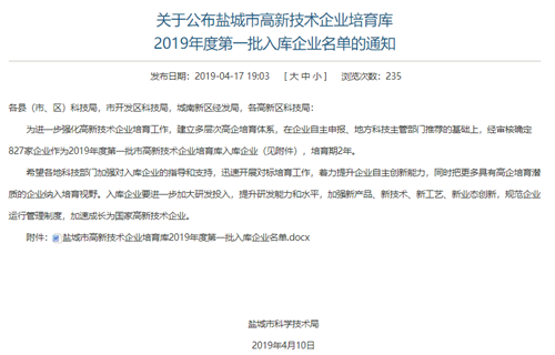 The identification of high-tech enterprises is a comprehensive evaluation and identification of the company's independent intellectual property rights, transformation ability of scientific and technological achievements, research and development organization and management level, enterprise growth indicators and talent structure. It needs to be screened layer by layer. This time, it can successfully enter the first batch of high-tech cultivation warehouses in Yancheng in 2019. It shows that the company has been fully affirmed and recognized by the Bureau of Science and Technology in R&D and innovation.