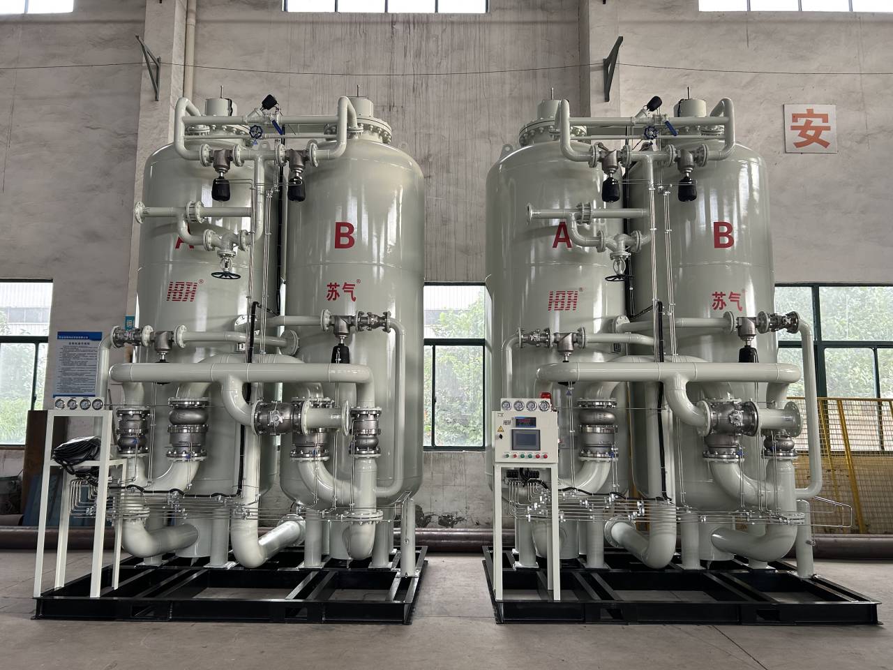 Introduction to process flowThe ambient air is compressed and purified to remove oil, water and dust, and then enters into a PSA device composed of two adsorption towers filled with carbon molecular sieves. Compressed air flows through the adsorption tower from bottom to top, during which oxygen molecules are adsorbed on the surface of carbon molecular sieve, nitrogen flows out from the upper end of the adsorption tower and enters the coarse nitrogen buffer tank. After a period of time, the oxygen adsorbed on carbon molecular sieve in the adsorption tower is saturated and needs to be regenerated. Regeneration is achieved by stopping the adsorption step and reducing the pressure of the adsorption tower. The two adsorption towers conduct adsorption and regeneration alternately to ensure the continuous output of nitrogen.