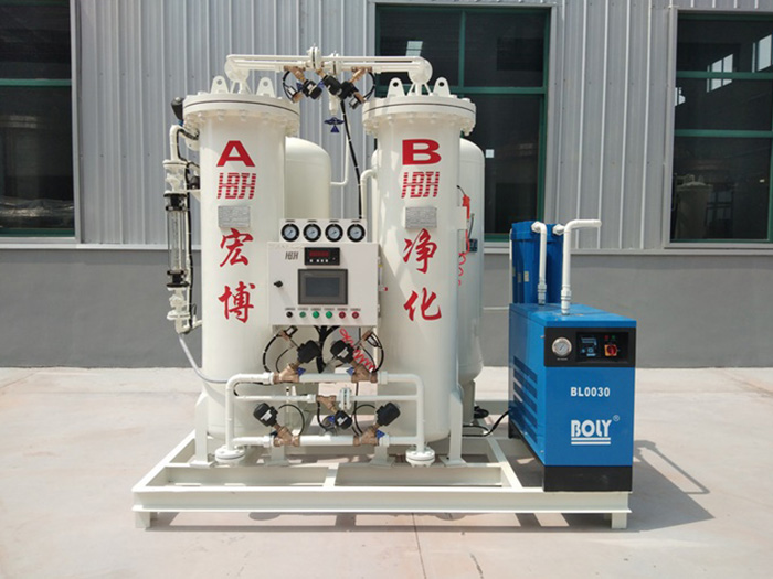 The ambient air is compressed and purified to remove oil, water and dust, and then enters into a PSA device composed of two adsorption towers filled with carbon molecular sieves. Compressed air flows through the adsorption tower from bottom to top, during which oxygen molecules are adsorbed on the surface of carbon molecular sieve, nitrogen flows out from the upper end of the adsorption tower and enters the coarse nitrogen buffer tank. After a period of time, the oxygen adsorbed on carbon molecular sieve in the adsorption tower is saturated and needs to be regenerated. Regeneration is achieved by stopping the adsorption step and reducing the pressure of the adsorption tower. The two adsorption towers conduct adsorption and regeneration alternately to ensure the continuous output of nitrogen.