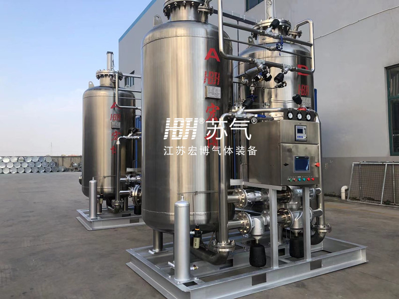 The ambient air is compressed and purified to remove oil, water and dust, and then enters into a PSA device composed of two adsorption towers filled with carbon molecular sieves. Compressed air flows through the adsorption tower from bottom to top, during which oxygen molecules are adsorbed on the surface of carbon molecular sieve, nitrogen flows out from the upper end of the adsorption tower and enters the coarse nitrogen buffer tank. After a period of time, the oxygen adsorbed on carbon molecular sieve in the adsorption tower is saturated and needs to be regenerated. Regeneration is achieved by stopping the adsorption step and reducing the pressure of the adsorption tower. The two adsorption towers conduct adsorption and regeneration alternately to ensure the continuous output of nitrogen.
